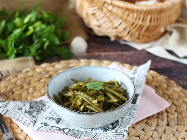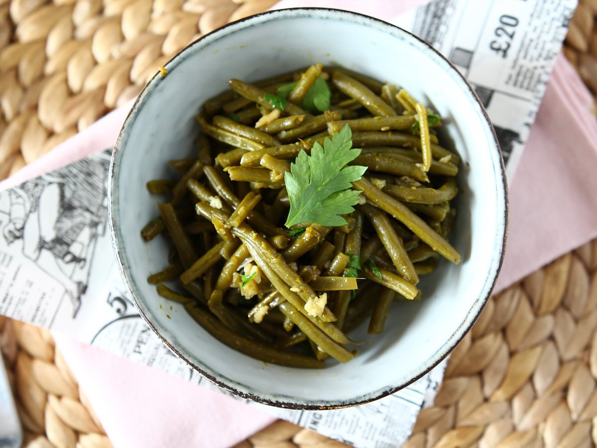 - Die grünen Bohnen waschen und entstielen, um die Fäden zu entfernen.