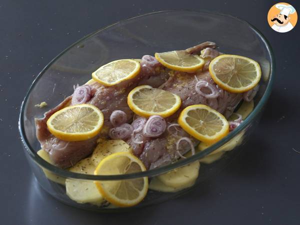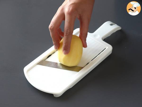 Die Kartoffel mit einer Mandoline so dünn wie möglich schneiden. Die Schalotte und die Zitrone in dünne Scheiben schneiden. Knoblauch zerdrücken.