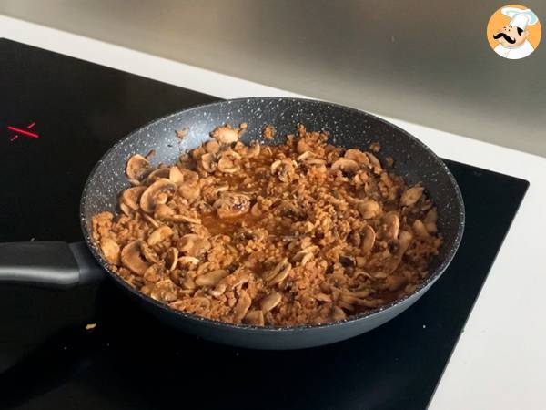 Erhitzen Sie das Olivenöl in einer Pfanne und geben Sie dann das eingelegte Sojaprotein und die Pilze hinzu. Bei mittlerer Hitze 10 Minuten lang braten, dabei gelegentlich umrühren.