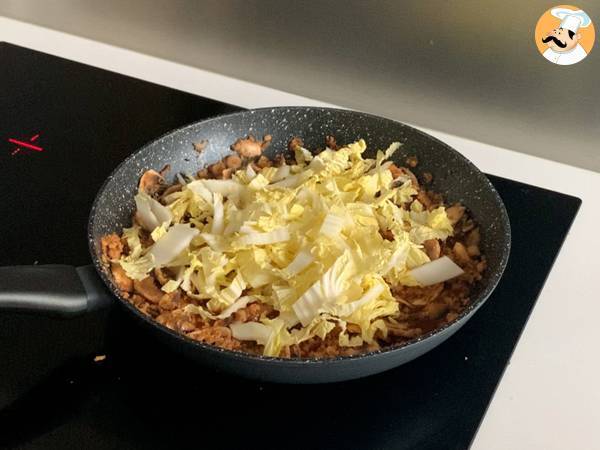 Fügen Sie den klein geschnittenen Chinakohl hinzu, rühren Sie um und lassen Sie ihn weitere 5 Minuten kochen. Der Chinakohl sollte duften, aber noch bissfest sein.