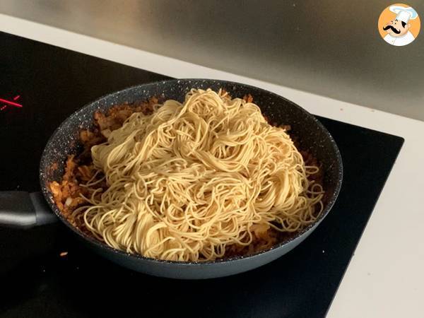 Wenn sie gekocht und abgetropft sind, geben Sie sie zusammen mit der Füllung in die Pfanne.