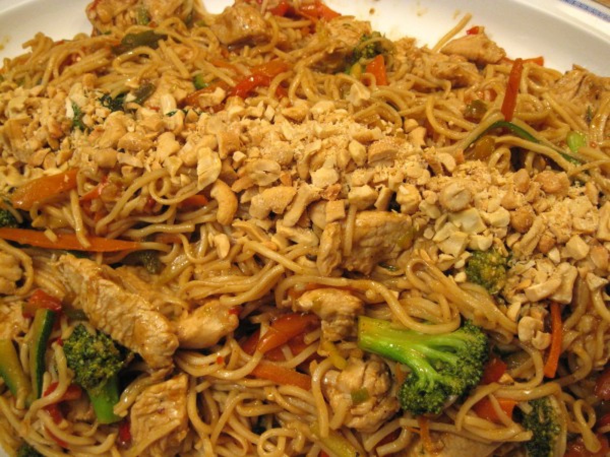 2 essloffel heißem Erdnussöl. Fry Noodles. Sherry Gießen Mischung. - Gemüse und Fleisch, um Wärme, Saison zugeben, abschmecken und servieren mit Cashewnüssen bestreuen.