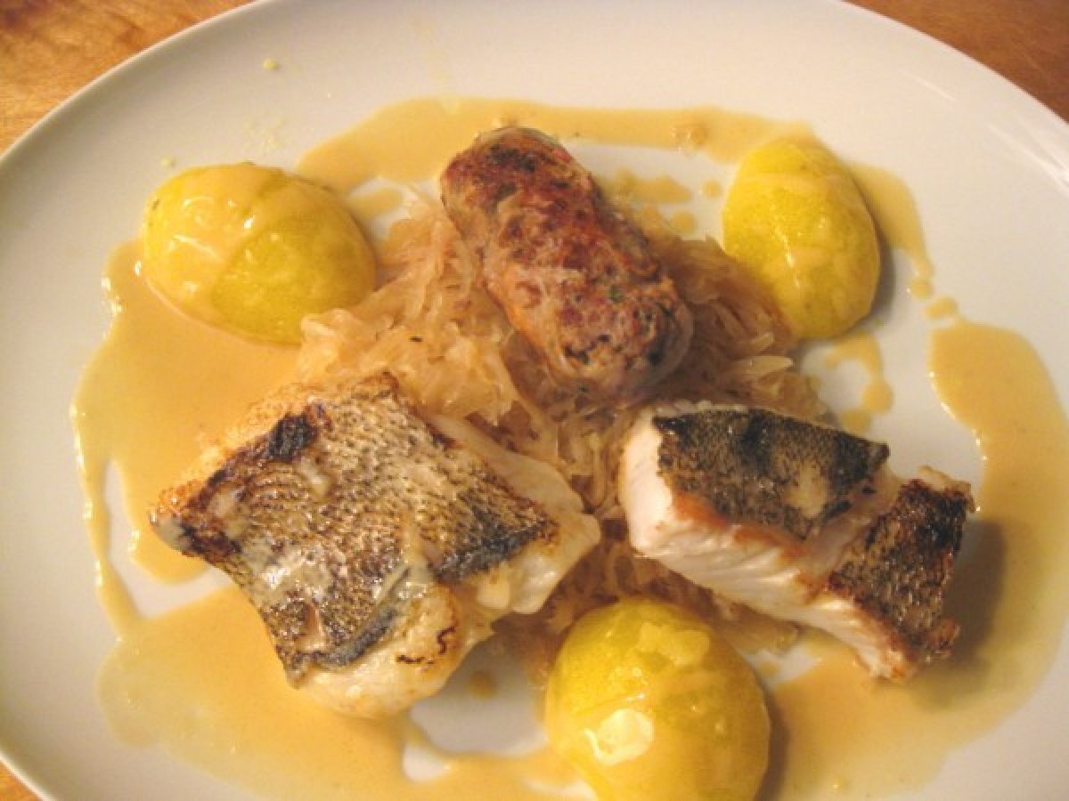 Öffnen Kochen Apfelsaft bei mittlerer Hitze 80 ml Sahne zugeben und zu reduzieren, um 120 ml. - Würstchen in Öl braten für 5 Minuten, um Sauerkraut legen und sogar 5.