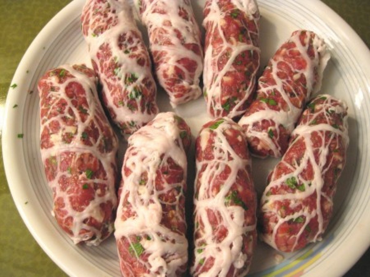 Mett, Eier, mix Fenchel und mit Salz und Pfeffer würzen. - Teilen Sie es in 16 Portionen, bilden Würstchen und wickeln Sie es in das Sieb.