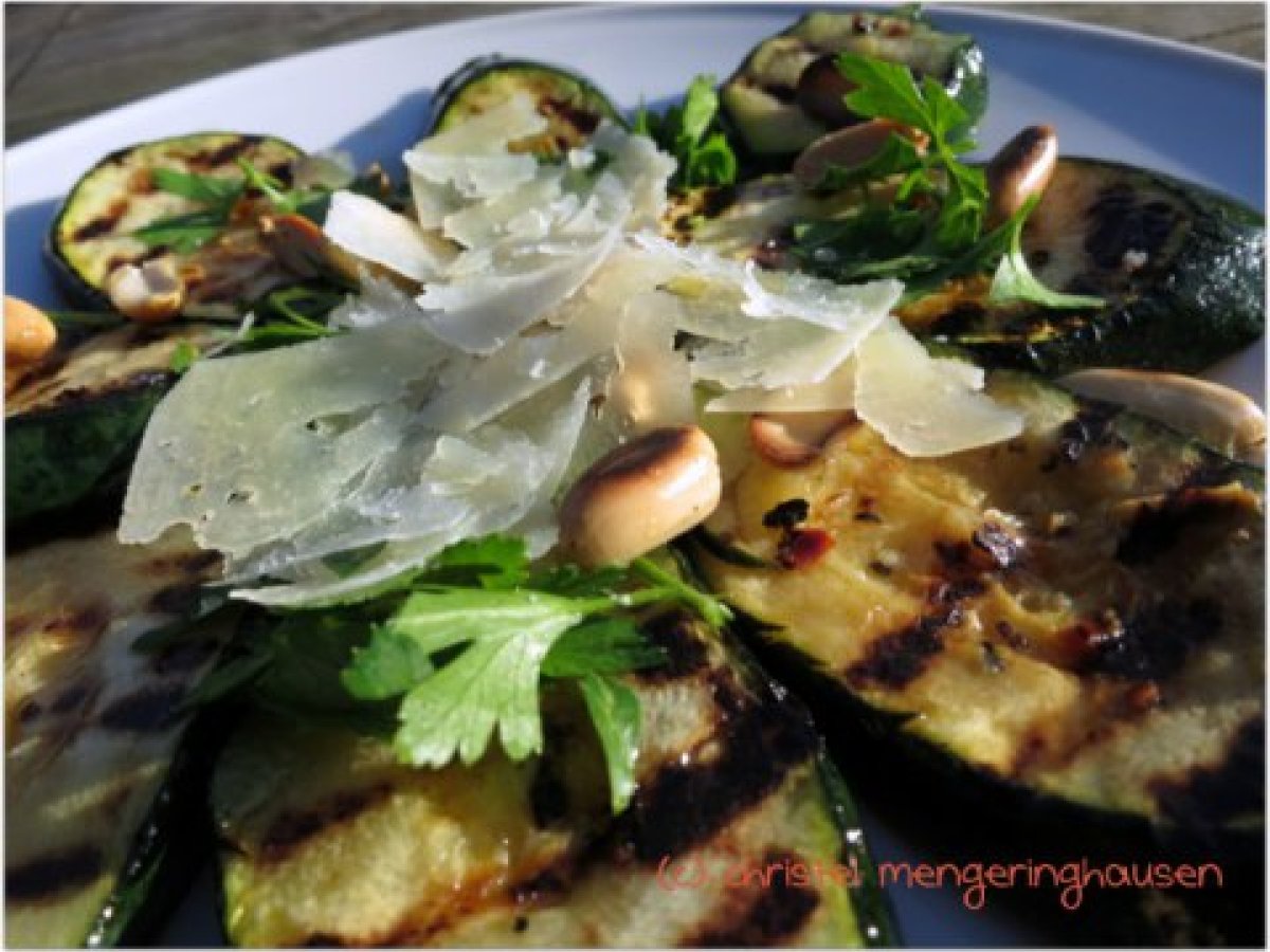 - Wenn die Zucchini abgekühlt sind diese mit der Petersilie und den Erdnüssen vermengen. Auf einem flachen Teller anrichten, mit dem Käse herrichten und mit dem Erdnussöl beträufeln.