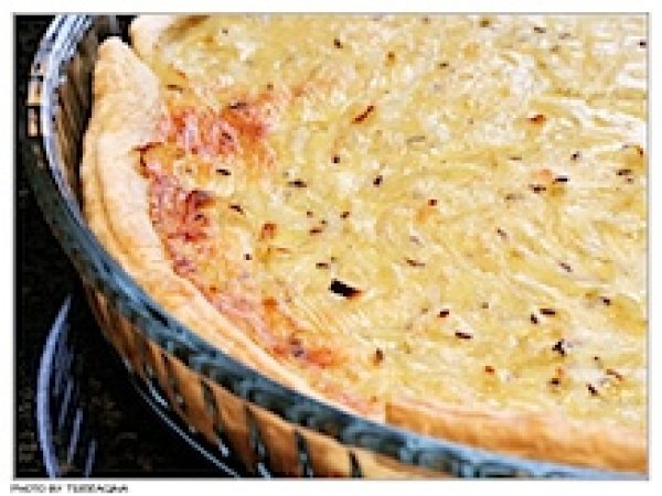 - Schließlich schnell die Zwiebeln rühren unter und geben Sie die Masse in der Torteplatte.