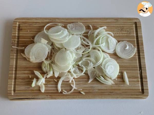 Schälen Sie zunächst die Zwiebel und schneiden Sie sie mit einer Mandoline in dünne Scheiben.