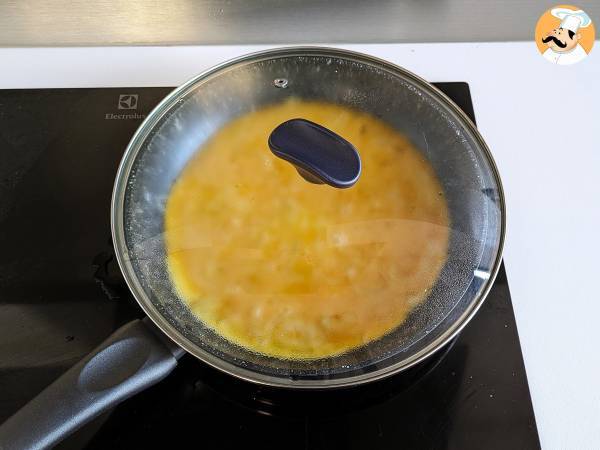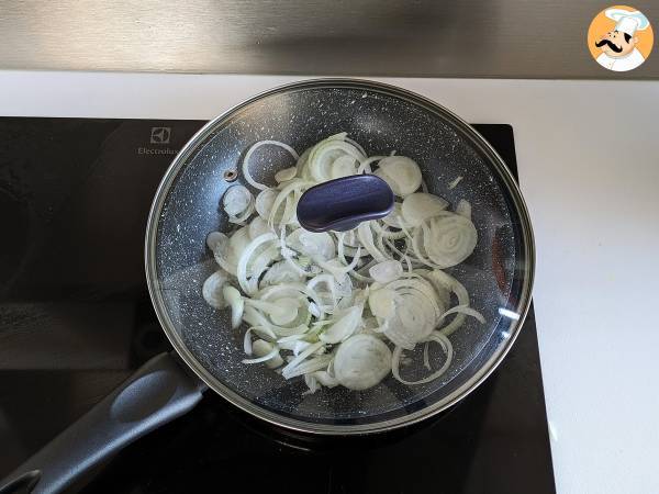 Das Garen der Zwiebeln ist sehr wichtig. Es ist wichtig, den Deckel zu verwenden, da der Dampf, der im Inneren entsteht, die Zwiebeln weich und ideal für das Omelett macht.