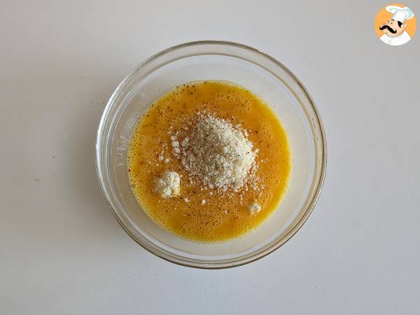 In der Zwischenzeit die Eier in einer Schüssel schnell verquirlen. Dann den geriebenen Parmesankäse, eine Prise Salz und etwas Pfeffer hinzugeben und alles gut vermischen.