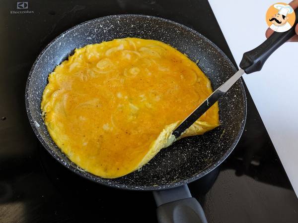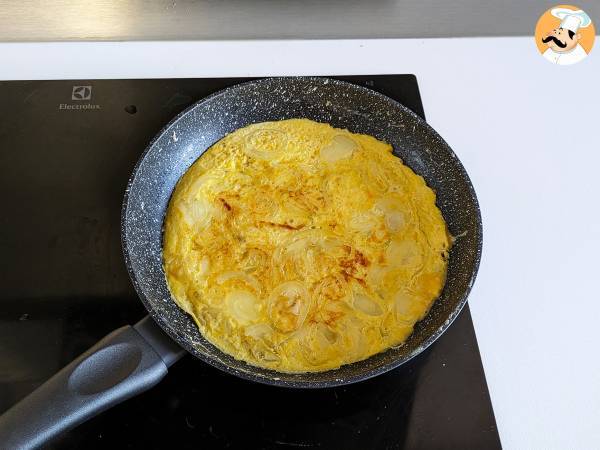 Nach dieser Zeit prüfen, ob sich die Ränder leicht lösen und ob der Boden durchgebacken ist. Dann das Zwiebelomelett mit Hilfe eines Tellers (oder eines flachen Deckels) wenden.