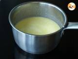 63 ml Milch und 125 g Sahne zum Kochen bringen. Fügen Sie die weiße Schokolade hinzu und rühren Sie, damit sie gut eingearbeitet wird. 63 ml Milch mit 5 g Gelatinepulver verrühren und diese Mischung bei mittlerer Hitze in den Topf geben.