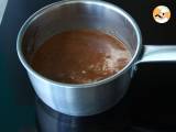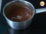 63 ml Milch und 125 g Sahne zum Kochen bringen. Die Zartbitterschokolade hinzufügen und umrühren, damit sie gut eingearbeitet wird. 63 ml Milch mit 5 gr Gelatinepulver verrühren und diese Mischung bei mittlerer Hitze in den Topf geben.