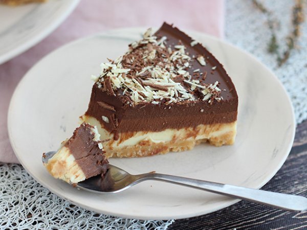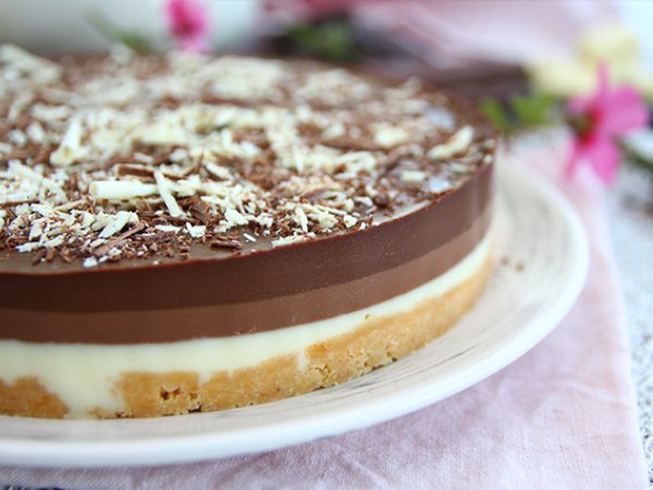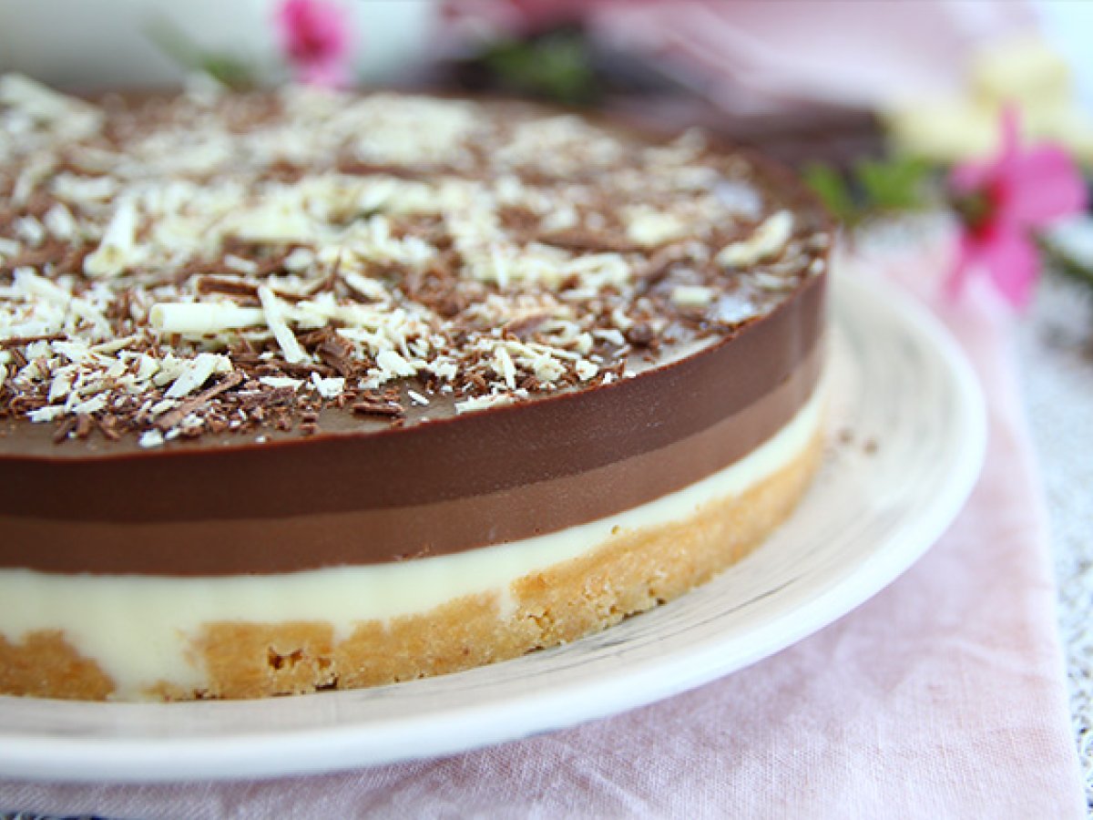 Sie können Ihren Dreischokoladenkuchen nach Belieben dekorieren. Wir haben uns dafür entschieden, Vollmilchschokolade und weiße Schokolade darauf zu reiben.