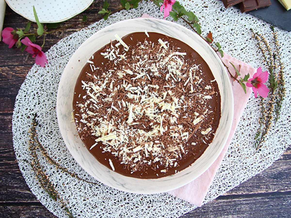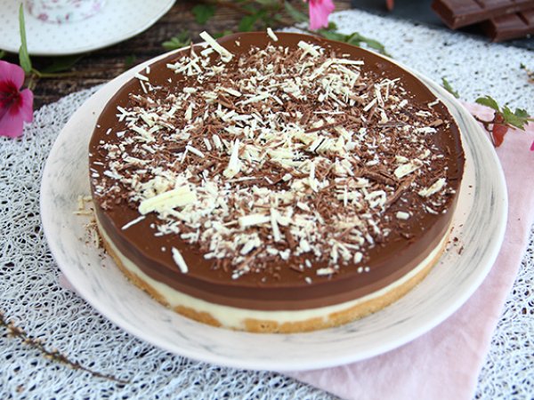 Die Masse unter gelegentlichem Rühren eindicken lassen. Die Torte aus dem Kühlschrank nehmen. Mit einer Gabel die Oberfläche der weißen Schokoladencreme abkratzen. Die Milchschokoladenmischung darauf gießen und 1 Stunde kühl stellen.