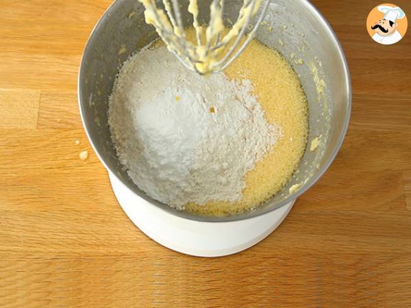 Schlagen Sie die Butter mit dem Zucker, bis sie eine cremige Konsistenz hat. Die Eier dazugeben und gut verrühren.