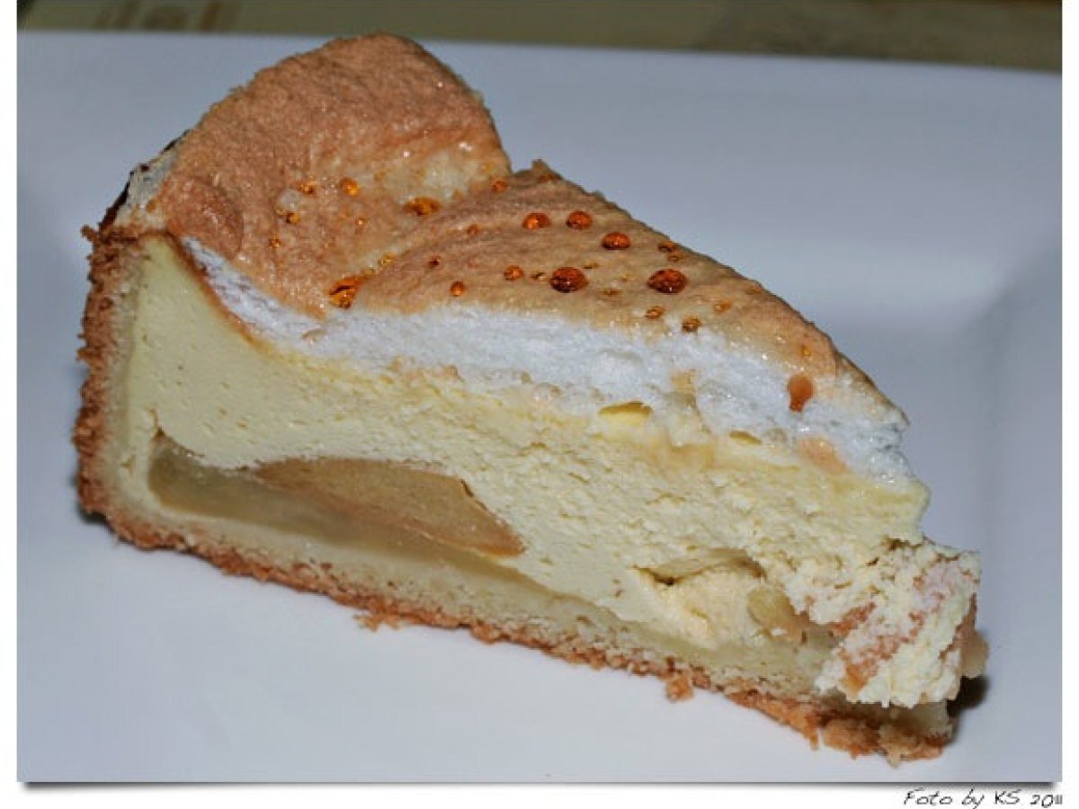 Für Zucker, Puddingpulver, Eigelb, Sahne und Quark Berühren einer glatten Creme verrühren und über die Äpfel. - Der Kuchen bei 180 ° C jetzt kochen 45 Minuten.