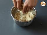 Mehl, gemahlene Mandeln und Zucker mischen. Die in kleine Stücke geschnittene kalte Butter dazugeben und mit den Fingern daruntermischen.