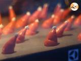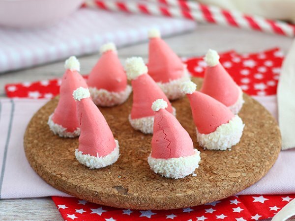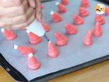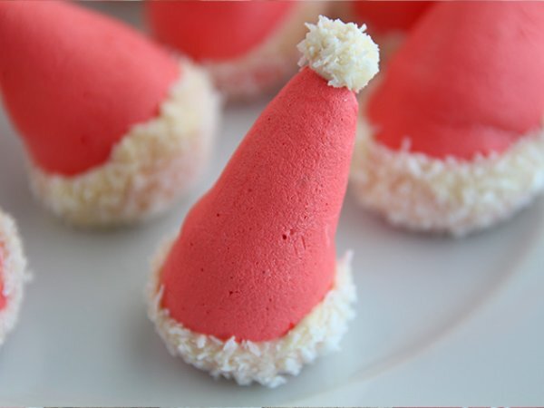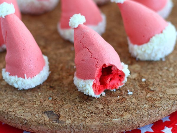 Die rote Baisermasse auf einem Backblech zu Mützen formen. Mit einer Schere die Spitze jeder Mütze abschneiden. Dann aus dem weißen Baiser kleine Ponpons auf jede Mütze machen.