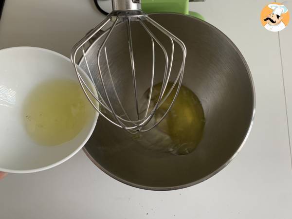 Eiweiß in die Schüssel der Küchenmaschine geben. Beginnen Sie, es bei mittlerer Geschwindigkeit zu schlagen.