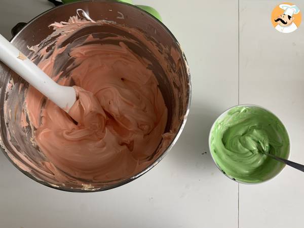 Wenn das Baiser fertig ist, legen Sie 3 bis 4 Esslöffel Baiser in einer kleinen Schüssel beiseite. Färben Sie den größeren Teil des Baisers rosa und den kleineren grün.