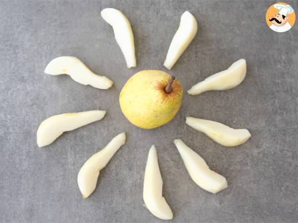 Rollen Sie den Teig in eine Kuchenform. Den Boden mit einer Gabel einstechen. Schokolade schmelzen. Die Birnen in 8 Scheiben schneiden.