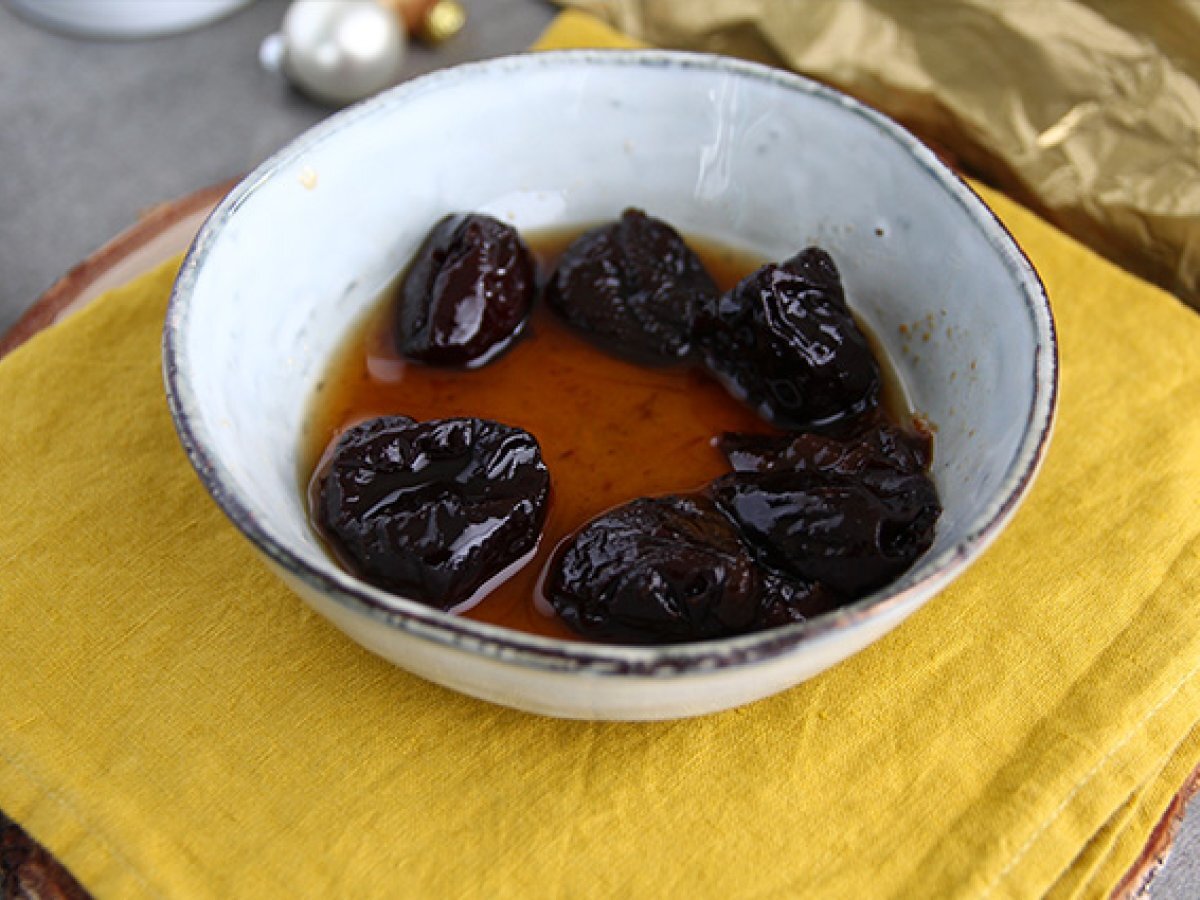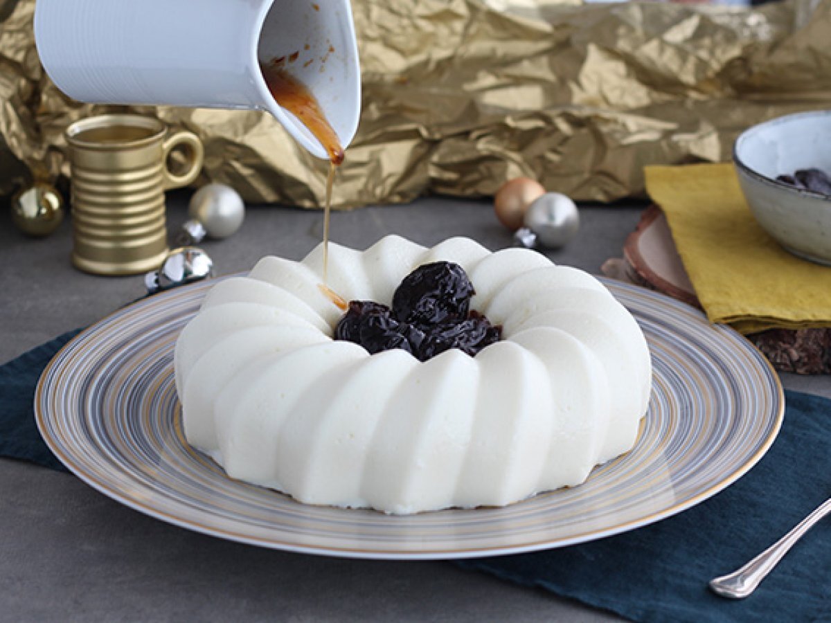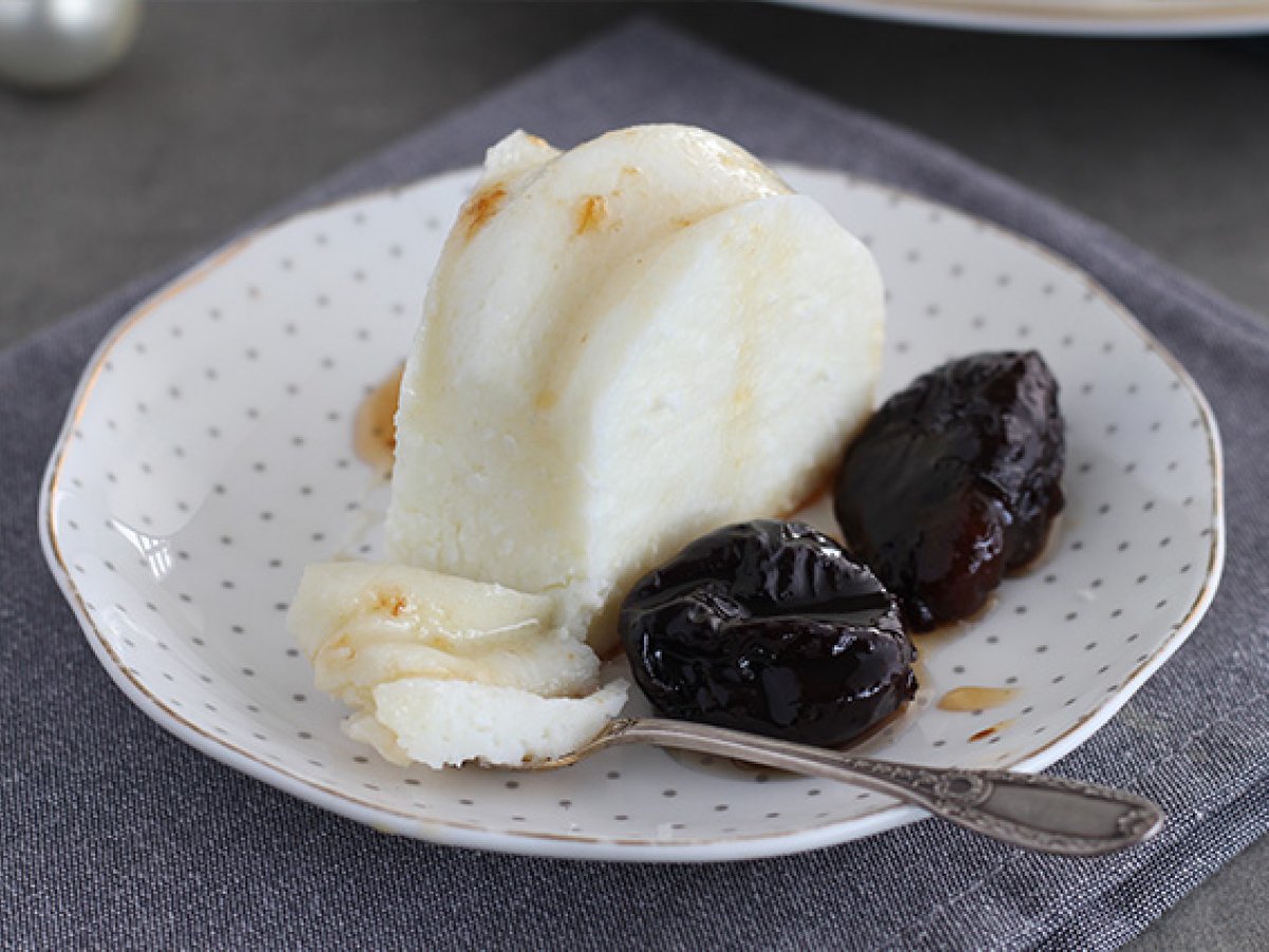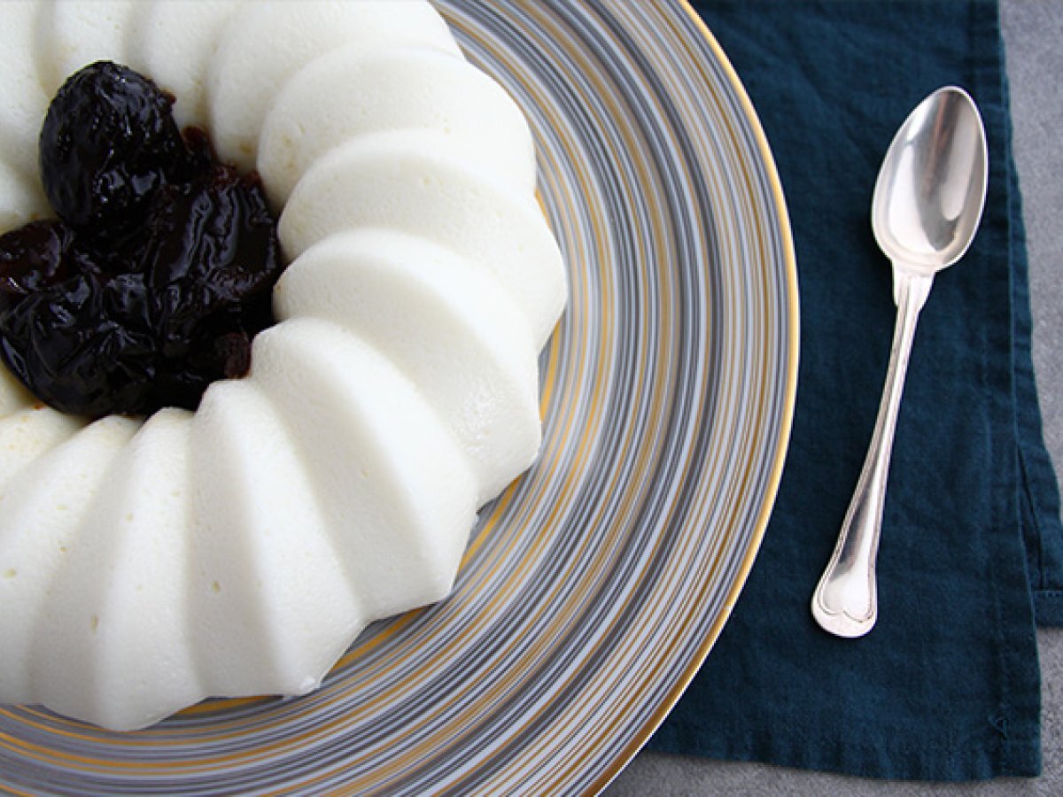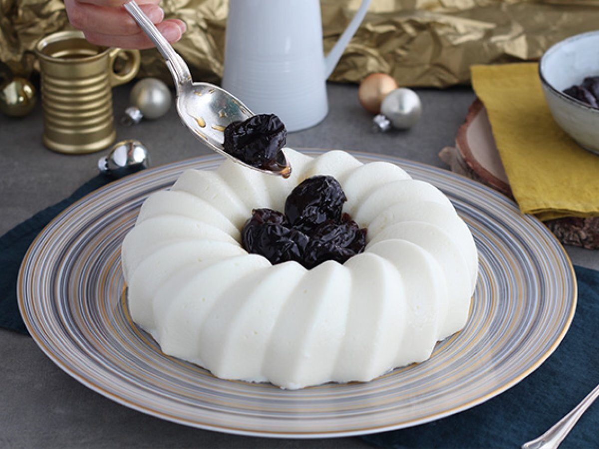 Den Manjar auf einen hübschen Teller stürzen und das Coulis in die Mitte oder auf den Pudding geben. Die Pflaumen in die Mitte legen.