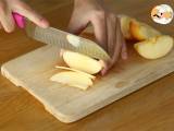 Schneiden Sie die Äpfel in dünne Streifen, wobei die Schale erhalten bleiben muss. Geben Sie die geschnittenen Streifen für 15 Sekunden in die Mikrowelle, damit sie weich genug sind, um gefaltet zu werden.