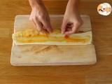Schneiden Sie den Blätterteig in 5 cm breite Streifen. Aprikosenkonfitüre entlang eines Blätterteigstreifens auftragen.