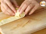 Falten Sie den unteren Teil des Teigstreifens über die Äpfel und rollen Sie ihn zusammen, sodass eine Rose entsteht.