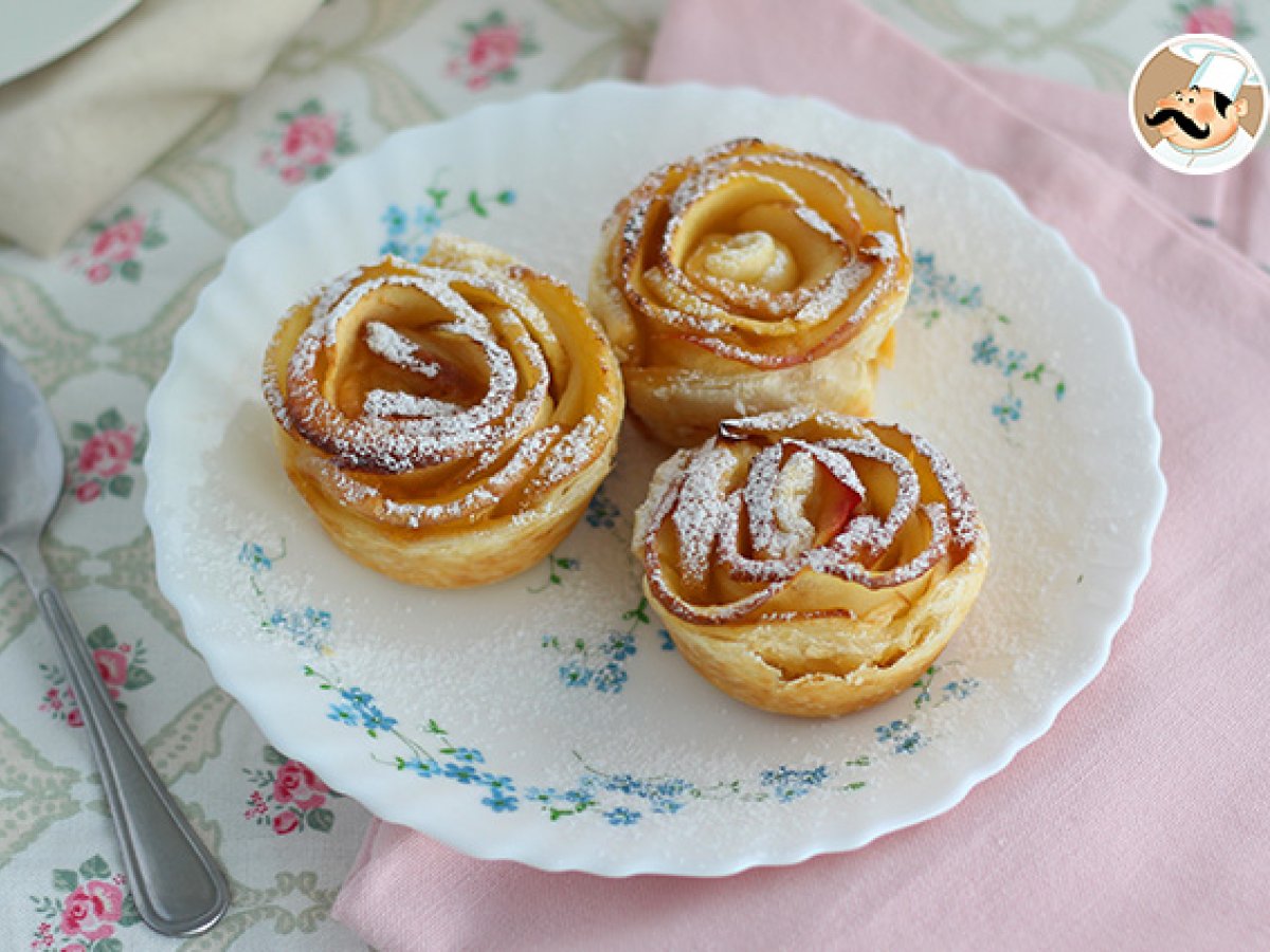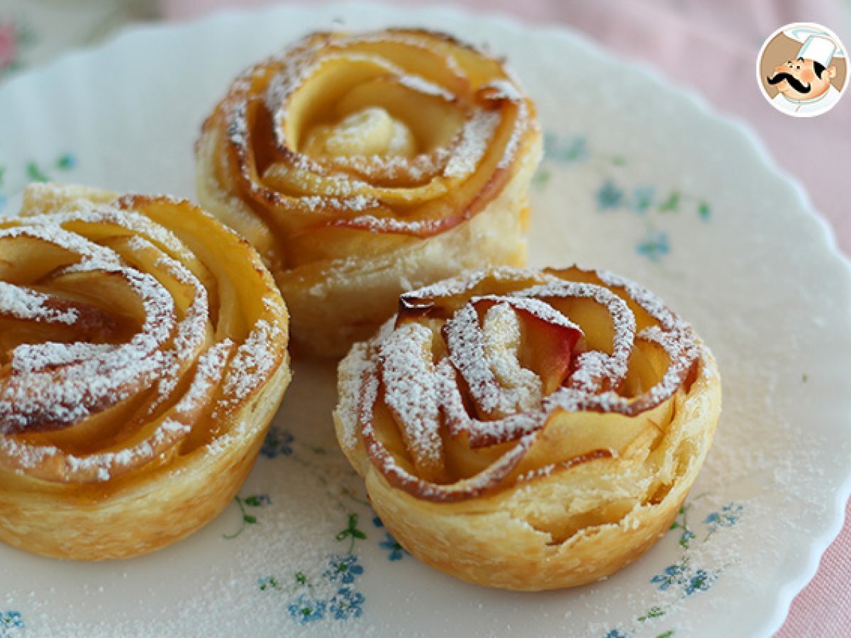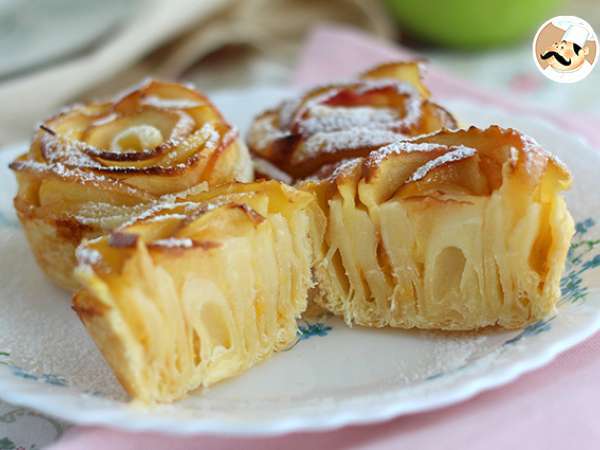 Bestreuen Sie sie mit Puderzucker et voilà! Ihre blättrigen Apfelrosen sind fertig!