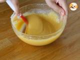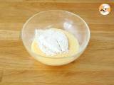 Verrühren Sie in einer Schüssel die Eier und den Zucker. Geben Sie das Mehl hinzu und verrühren Sie es erneut.