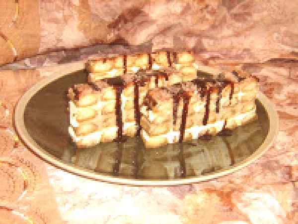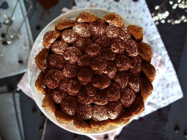 Die Löffelbiskuits mit Sahne bedecken. Die Oberseite mit Kakaopulver bestreuen. Die Löffelbiskuits in Kaffee einweichen und die Sahne damit bedecken.