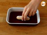 Ordnen Sie sie rundherum in der Form an (glatte Seite nach innen). Tauchen Sie die Löffelbiskuits vollständig in den Kaffee und belegen Sie den Boden der Form.