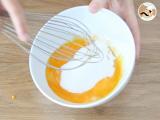 Die Mischung „Eigelb + Zucker“ in eine Schüssel geben.Dann die zuvor gefilterte und abgekühlte Mischung „Milch + Sahne“ hinzufügen und vermischen.