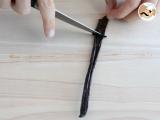 Schneiden Sie eine Kerbe an einem Ende der Schote und schneiden Sie dann bis zum anderen Ende, um die Samen zu extrahieren.