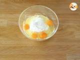 Mehl und Salz in einer Schüssel vermischen. Eine Mulde formen und die Eier hinzufügen. Mischen, dann das Öl hinzufügen.