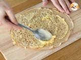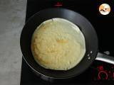 Erhitzen Sie einen Crêpes-Maker und tragen Sie mit einem Papiertuch etwas Öl auf. Eine Kelle Teig einfüllen und 1 Minute backen, dann den Pfannkuchen umdrehen. 1 Minute kochen lassen und vom Herd nehmen.