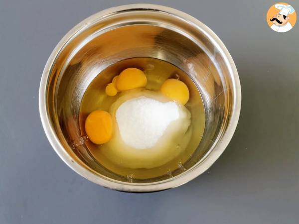 Die Eier in eine Schüssel geben, den Zucker und das Maizena hinzufügen und gut verrühren.