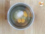 In einer Teigschüssel die Eier aufschlagen und den Zucker hinzufügen. Mit einem Schneebesen verrühren, bis eine homogene Masse entsteht.