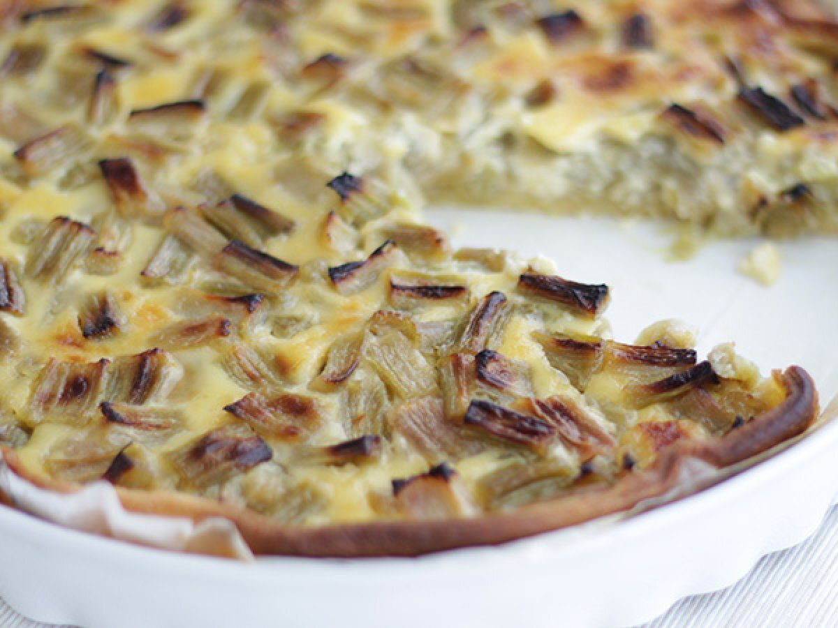 Den Mürbeteig in eine Tarteform legen und den Boden mit einer Gabel einstechen, damit der Teig beim Backen nicht aufgeht. Die abgetropften Rhabarberstücke darauf verteilen, da der Rhabarber während des Mischens mit dem Zucker (Schritt 1) Wasser abgegeben hat.