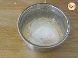 Das Eigelb mit dem Zucker schlagen, bis die Masse weiß wird. Zitronensaft und -schale hinzufügen, dann Mehl und Backpulver und zuletzt die geschmolzene Butter.