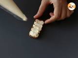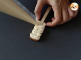Geben Sie die Mischung in einen Spritzbeutel und spritzen Sie dann Sahne auf, indem Sie Linien auf die flache Seite eines Kekses zeichnen.
