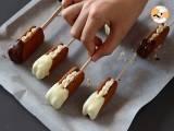 Legen Sie das beschichtete Eis auf ein mit Backpapier überzogenes Tablett und legen Sie es für mindestens 15 Minuten in den Gefrierschrank, damit die Schokolade gut einfrieren kann.