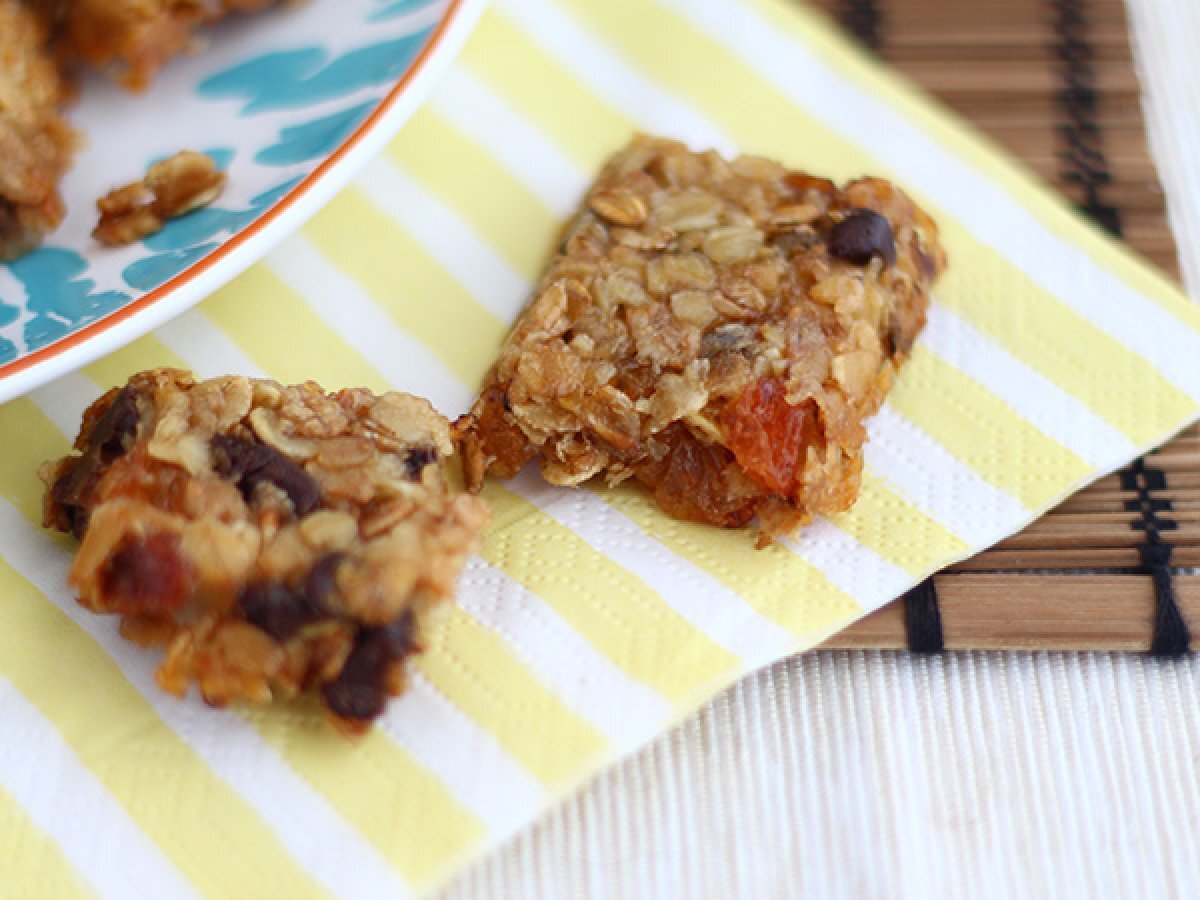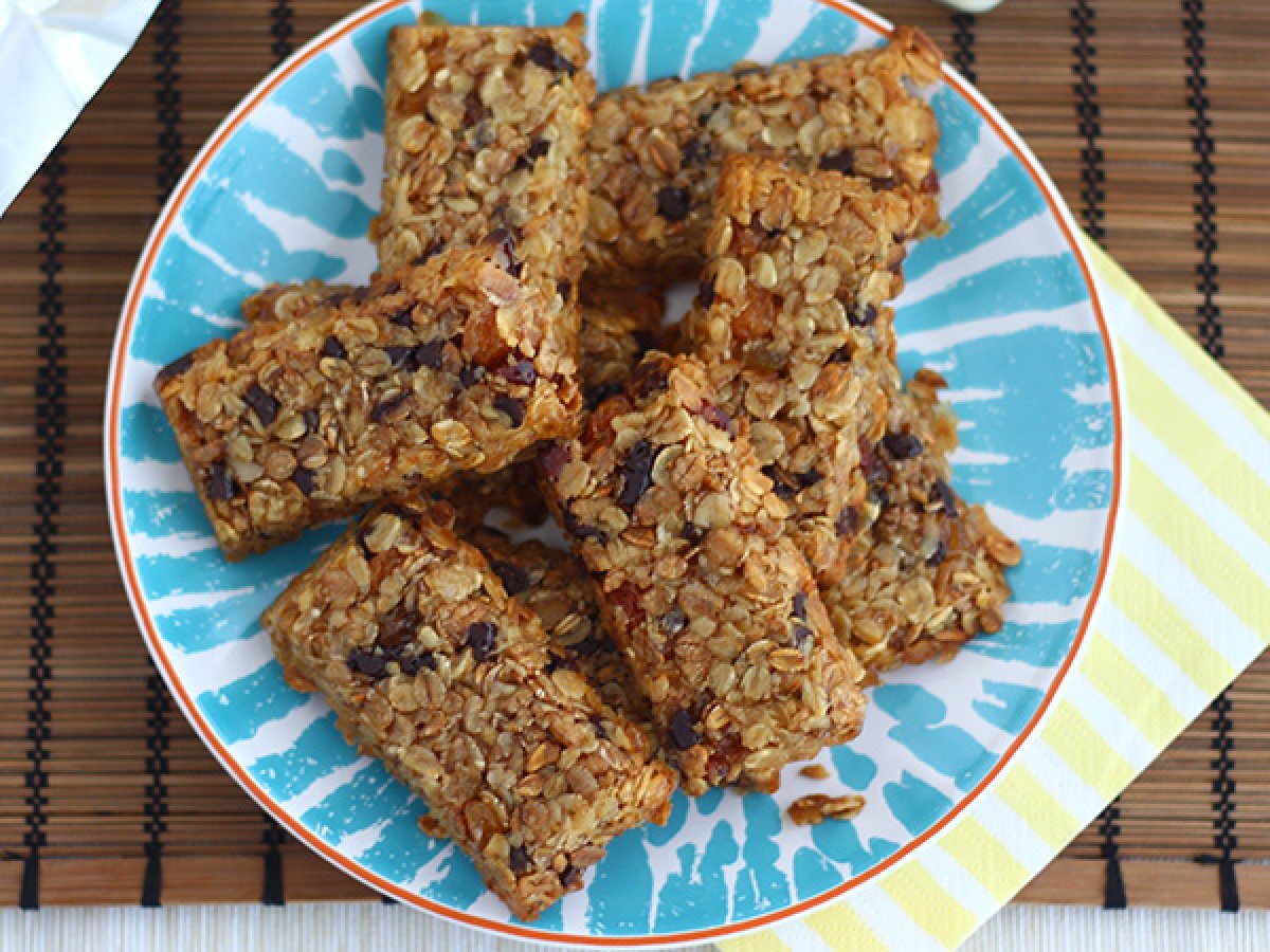 Rezept nach eigenem Geschmack anpassen: Die Schokoladenstückchen können durch Walnüsse oder Erdnüsse ersetzt werden, die Rosinen durch andere Trockenfrüchte, die Grundgetreidearten durch andere.