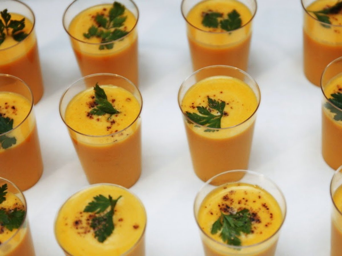 - Den halben Becher Schmand und die Gemüsebrühe unterrühren, aufmixen und mit Salz und weißem Pfeffer abschmecken. Kalt stellen. Die Minze sehr klein hacken und dazu geben.