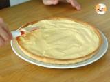 Sobald der Kuchenboden und die Sahne abgekühlt sind, schlagen Sie die Kuchencreme, um sie zu entspannen. Tragen Sie es in den Kuchenboden.