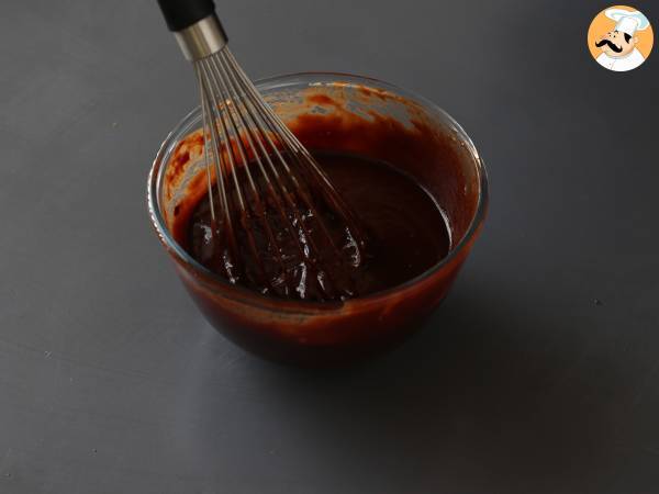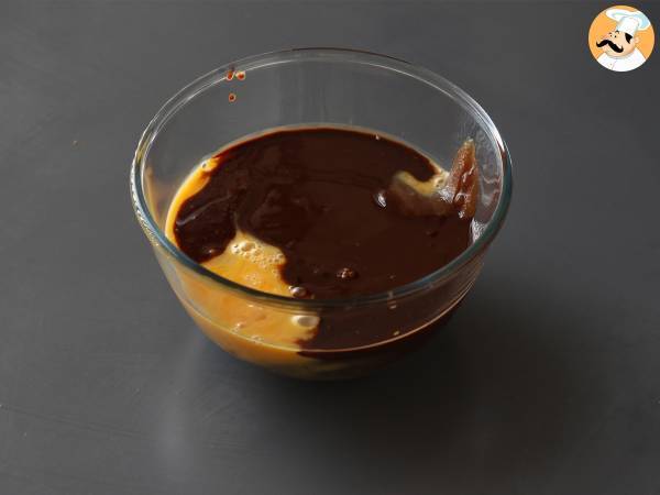 Die Kastaniencreme in eine Schüssel geben. Geben Sie die Eier hinzu. Butter und Schokolade schmelzen. Alles in die Schüssel gießen.