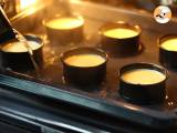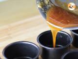 Gießen Sie den Teig in jeden karamellhaltigen Rahm. Die Ramequins in einen tief gebratenen Löffel geben und kochendes Wasser in ein Marienbad gießen.