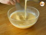 Schlagen Sie die 3 Eier, dann wenn die Milch gekocht ist, gießen Sie sie über die Eier unter Rühren.