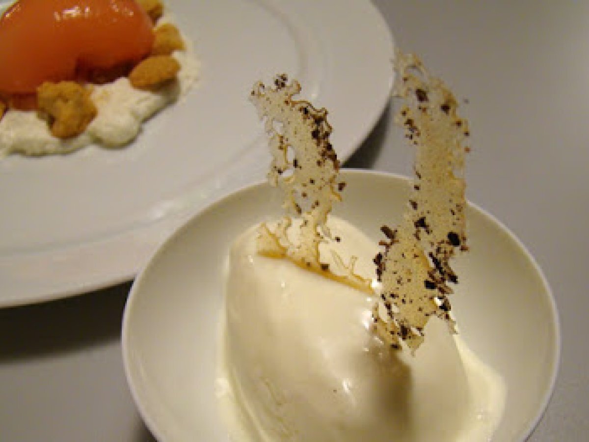 Früchte-crumble, sauerrahm-thymian-eis, kubebenpfeffer-krokant